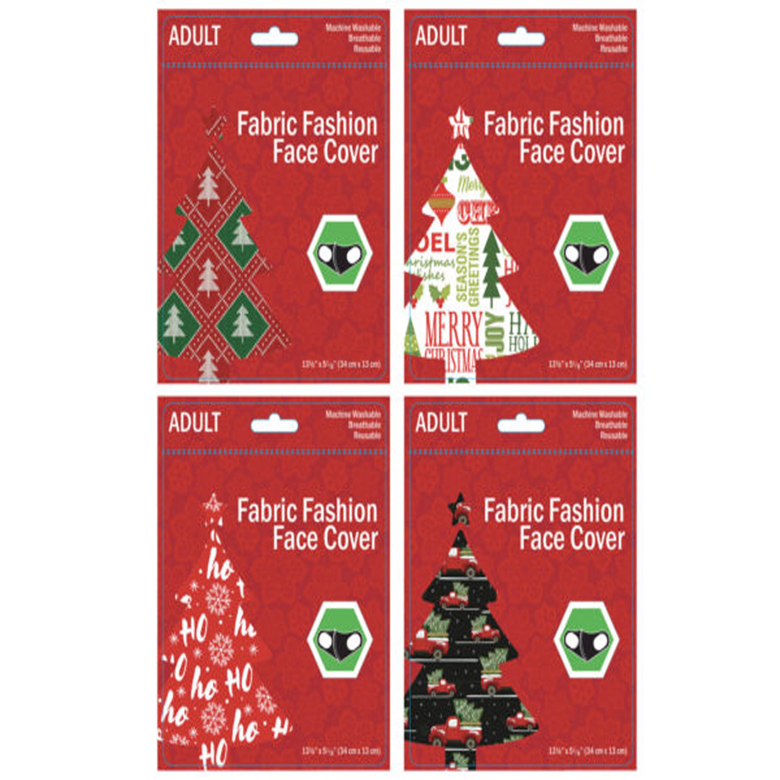 Assorted Designs for Festive Variety: Each pack includes 4 assorted designs, ensuring that you have a variety of options to choose from. The masks come in unique colors and designs, featuring different Christmas motifs. One mask is red in a quilted design with green and red Christmas trees, another mask is white in a greeting card design, the third mask is red with a white "Ho Ho Ho" print and snowflakes, and the final mask is black with red trucks carrying a Christmas tree. With these festive designs, you can showcase your holiday spirit while staying protected.