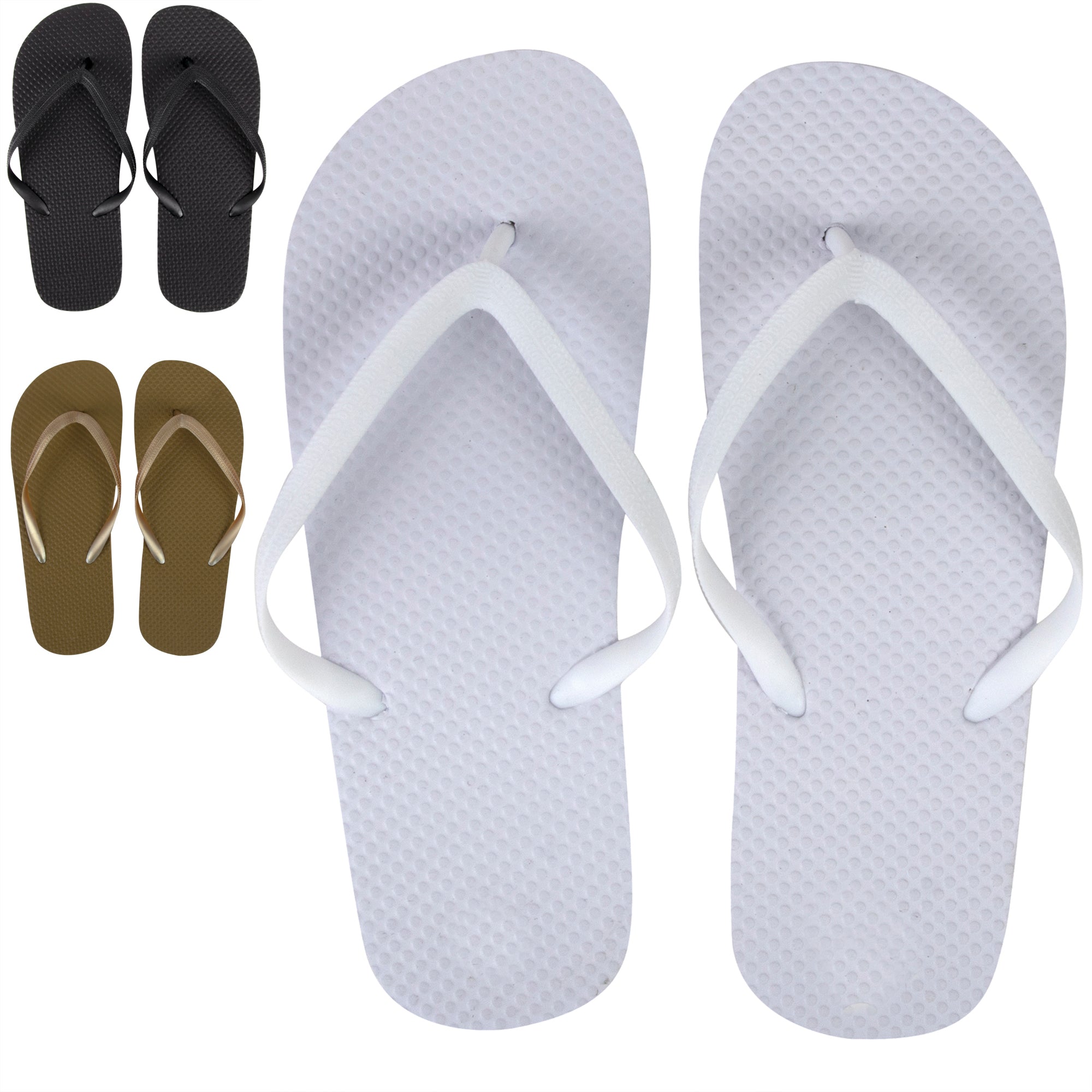 Convenient Assortment: Each size assortment includes a combination of Black, White, and Gold flip flops, ensuring a variety of options for customers.