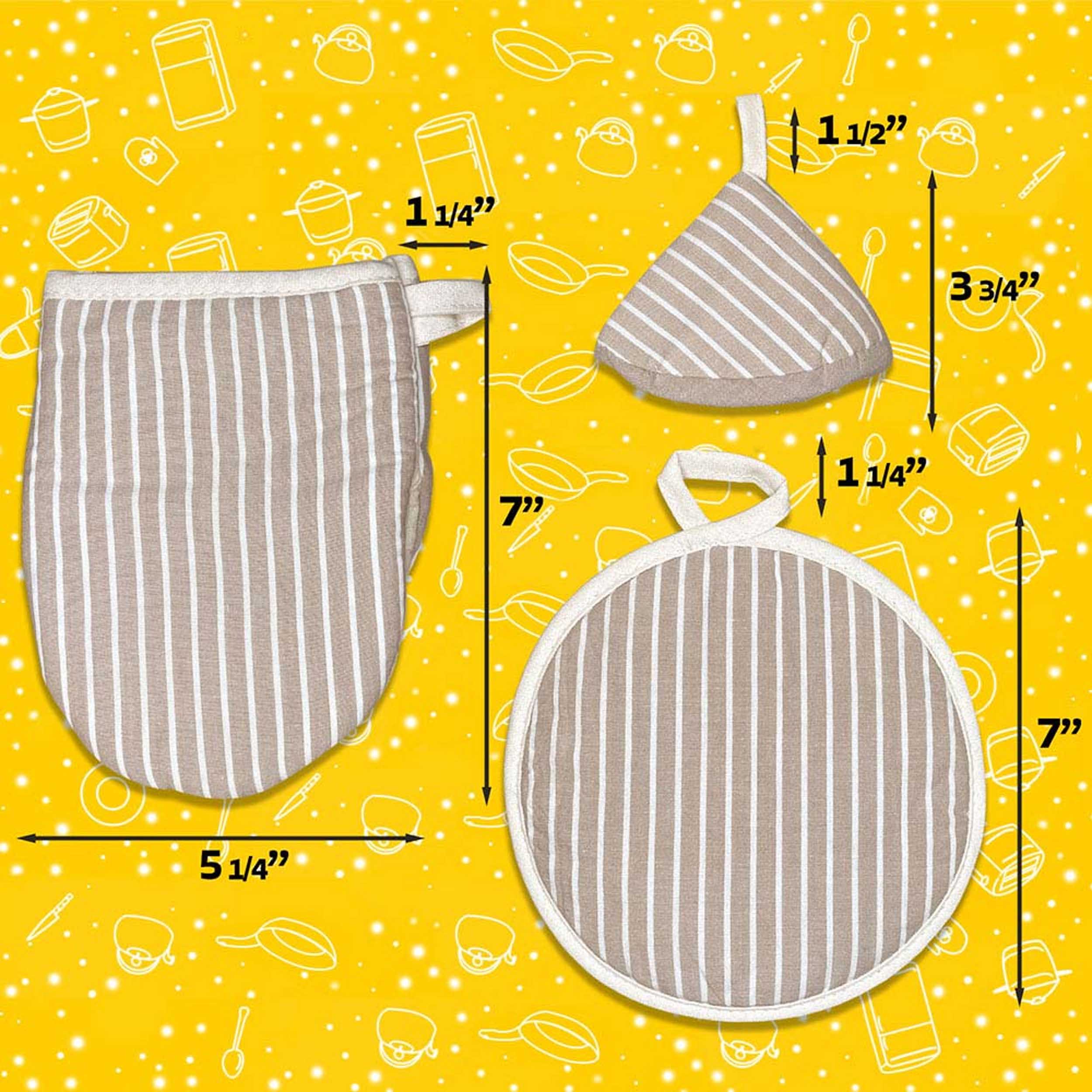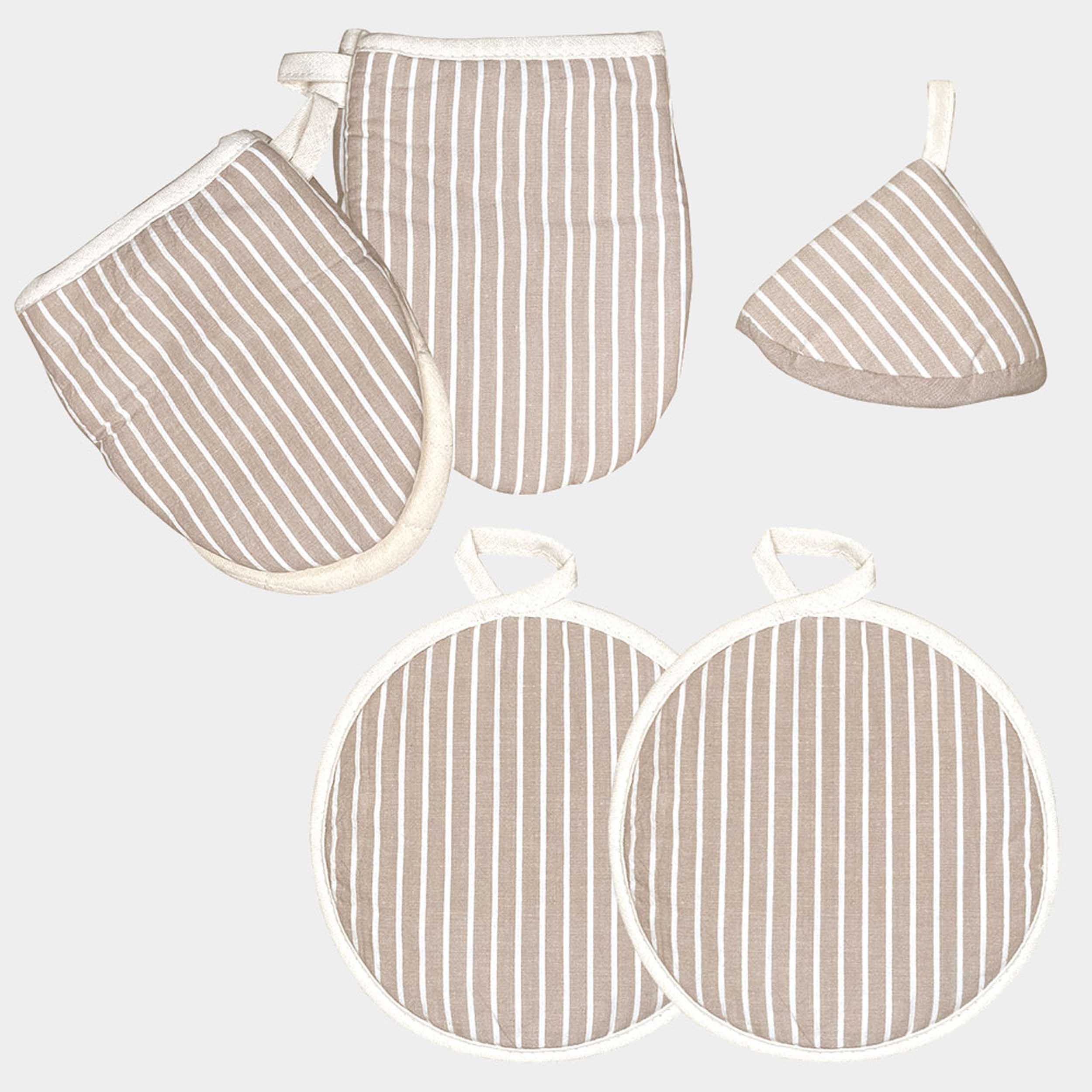 Elevate your kitchen decor with our 5-piece Striped Kitchen Set in a sophisticated beige tone. This set includes 1 holder, 2 gloves, and 2 hot pads, all featuring stylish striped patterns. Functional and aesthetically pleasing, these kitchen essentials add a touch of elegance while protecting your hands and surfaces during cooking and baking.