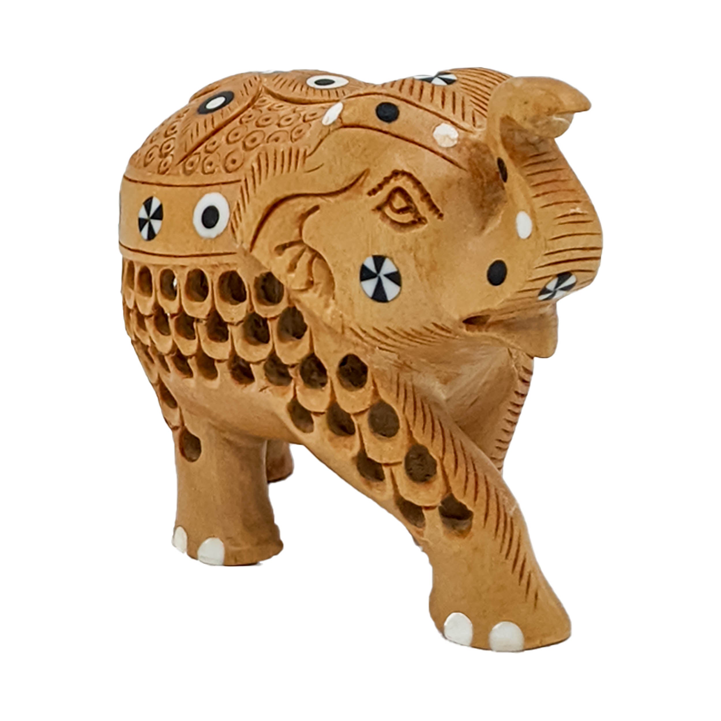 Introduce elegance and cultural richness into your home decor with our Handmade Jali Trunk-Up Carved Elephant. Crafted with precision and care, this exquisite elephant sculpture features intricate Jali (lattice) work, meticulously cared from premium material. The elephant, with its trunk up—an auspicious symbol—embodies strength, wisdom, and good fortune. Whether placed on shelves, side tables, or as a centerpiece, this artisan-crafted elephant adds a touch of grace and symbolism to your living space, making it a perfect statement piece for your home.