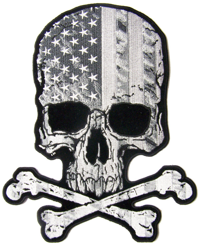 Home Wholesale JUMBO SKULL X BONES USA FLAG B & W EMBROIDERED PATCH 10 INCH (Sold by the piece)