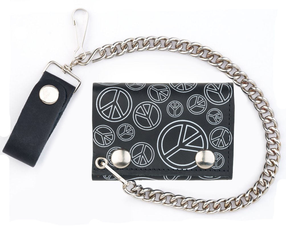 Home Wholesale OPEN PEACE SIGNS TRIFOLD LEATHER WALLETS WITH CHAIN (Sold by the piece)