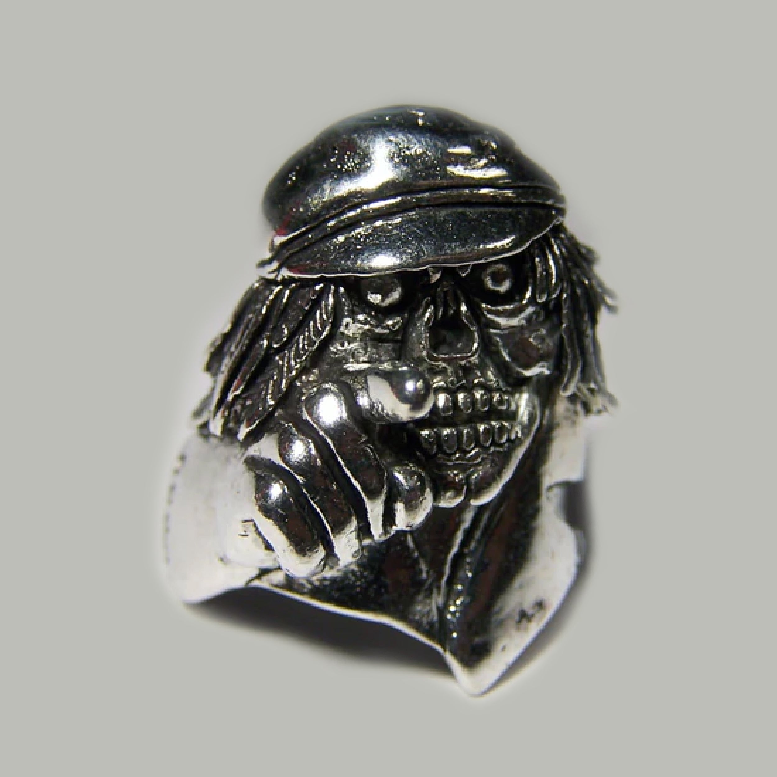 Intriguing Skeleton Pointing with Hat Design: Featuring a detailed skeleton pointing with a hat, this ring is a striking statement piece that captures the essence of rebellion and individuality.