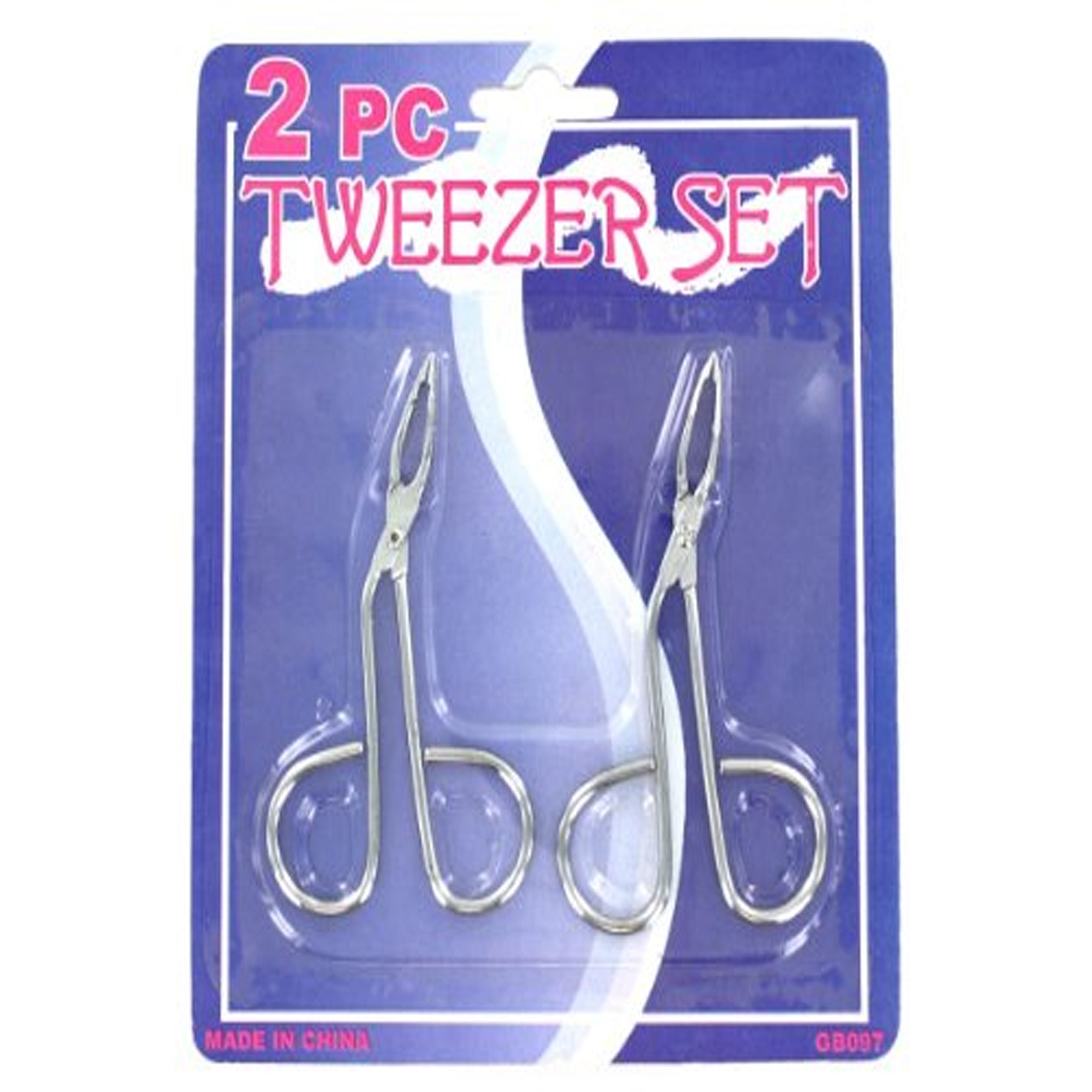 Perfect for professional or home use, this 2-piece Tweezers Set features a convenient scissor-style design. Approximate measurements: 3" long with 1/8" wide tip surfaces and 11/16" diameter finger openings. Comes packaged in a blister pack.