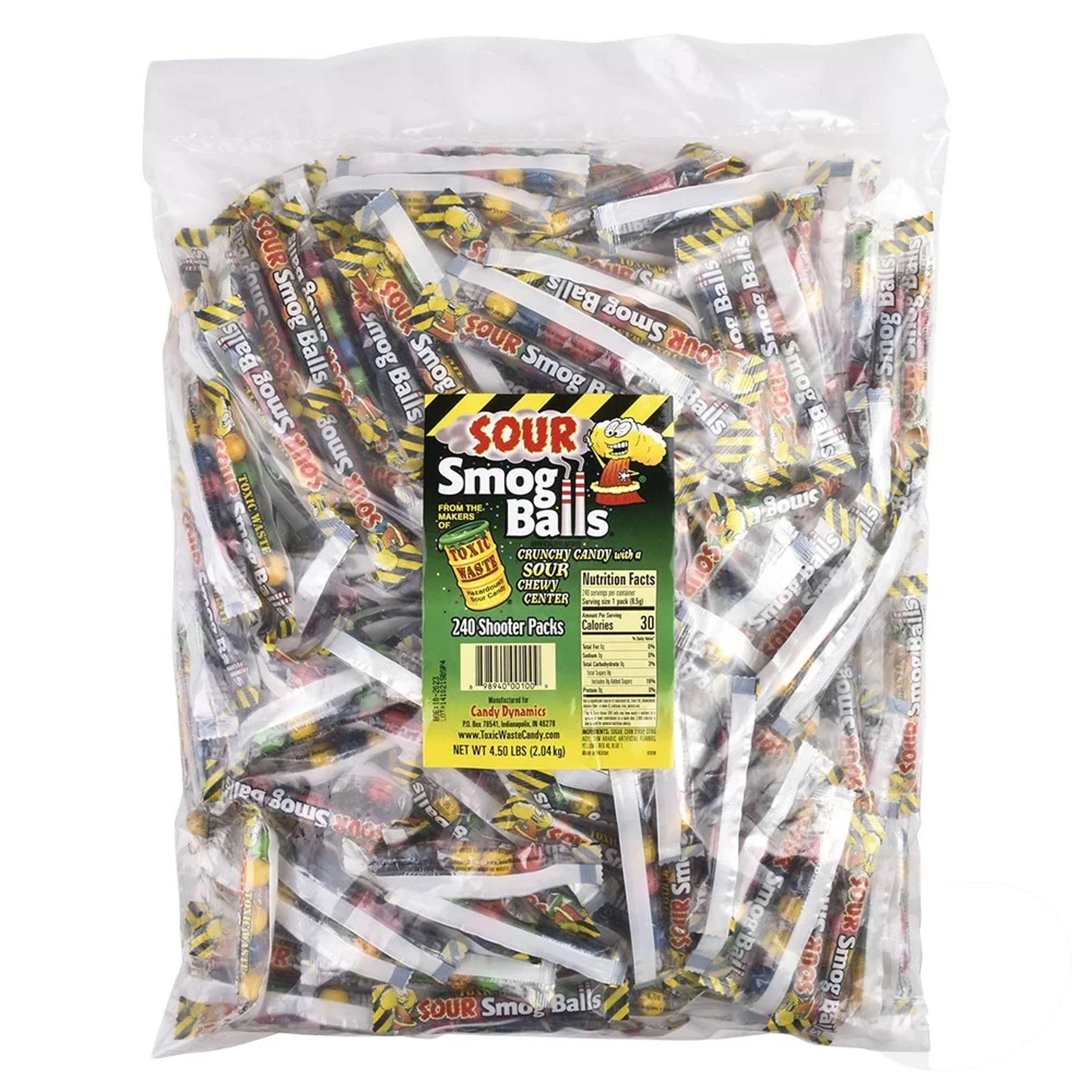 Experience an explosive burst of flavor with our Toxic Waste Smog Balls Shooter! These tantalizing treats feature a thrilling combination of crunchy candy on the outside and a delightfully sour, chewy center that will leave your taste buds tingling with excitement. Each pack contains 5 candies, ensuring you have enough sour goodness to keep the fun going. Sold individually by the unit, and each unit includes a whopping 240 packs, so you'll have an abundance of these flavorful shooters to enjoy or share with friends. Get ready for a sour sensation that's sure to satisfy your candy cravings!