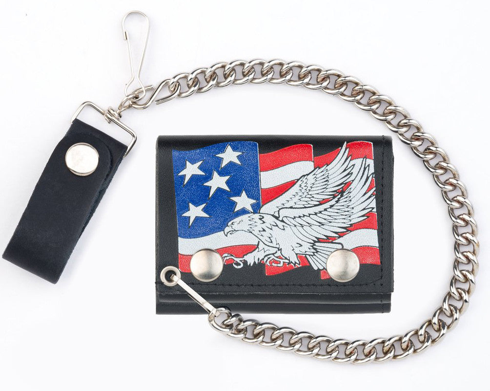 Home Wholesale USA FLAG FLYING EAGLE TRIFOLD LEATHER WALLETS WITH CHAIN (Sold by the piece)